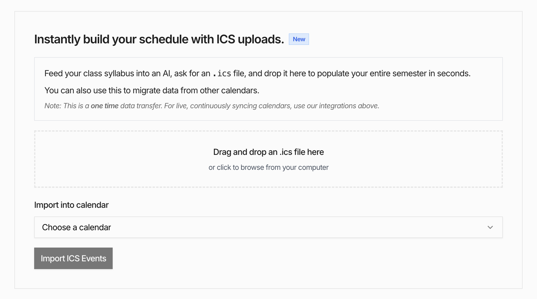 - ICS File Imports: Pull in schedules from your external calendars we don't integrate with, or create custom ICS files with AI and upload them here