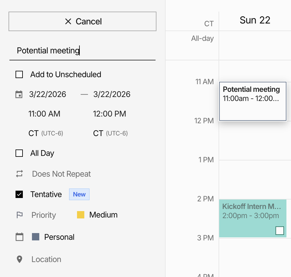 - Tentative Events: Visually hold space on your calendar without locking it in as a hard commitment. Perfect for drafting your week before finalizing your schedule.